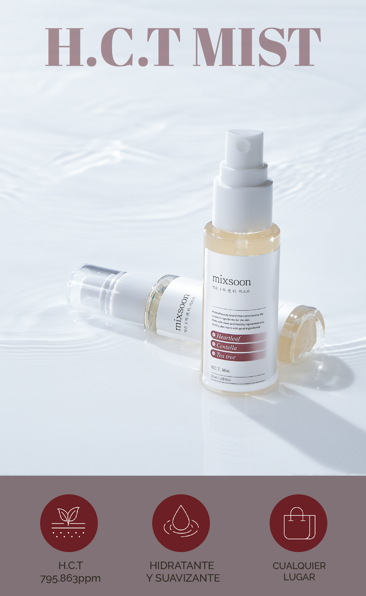Descripción: Mixsoon HCT Mist es una bruma HCT para pieles con tendencia acneica. Sus ingredientes estrella incluyen extracto de hoja de Melaleuca Alternifolia (árbol de té), extracto de Houttuynia Cordata y extracto de Centella Asiática, que se combinan para calmar la piel irritada y con problemas. Enriquecida con pantenol y ácido hialurónico, que aportan hidratación extra a la piel.